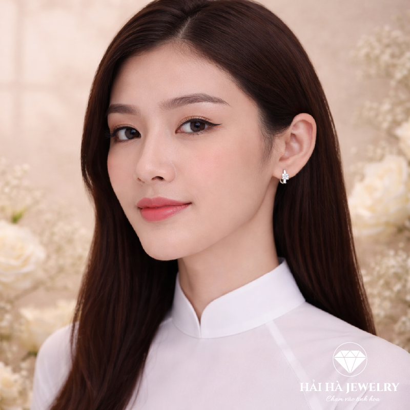 Ánh bạc sạch, không phô, mặt đá sáng tự nhiên, không tạo hiệu ứng lấp lánh quá mức, toàn bộ thiết kế được giữ ở trạng thái cân bằng giữa hiện diện và tiết chế, không quá nhỏ để biến mất nhưng cũng không đủ lớn để chiếm lấy gương mặt.