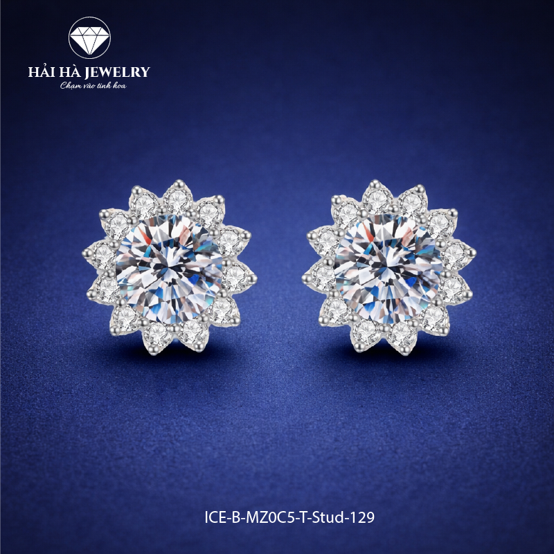 Bông tai nụ với viên moissanite tròn làm tâm điểm, được bao quanh bởi vòng đá nhỏ sắp xếp đều, tạo hình như những cánh hoa tỏa sáng. Tổng thể cân đối, tròn đầy, mang lại cảm giác dịu dàng nhưng vẫn nổi bật khi nhìn gần.