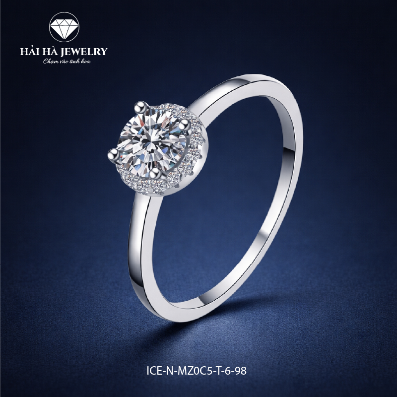 Thiết kế tập trung vào viên moissanite tròn ở trung tâm, được ôm nhẹ bởi viền đá nhỏ xếp đều, tạo hiệu ứng sáng lan tỏa nhưng không quá phô trương. Viền halo giúp viên đá chính nổi bật hơn, đồng thời giữ tổng thể cân đối và hài hòa.